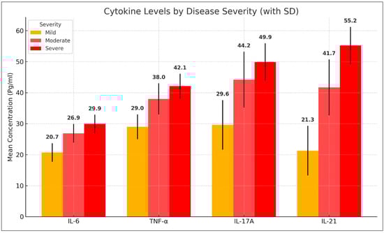 Cytokine levels varied significantly across different severity groups. Patients with mild AA had lower levels of IL-6, TNF-α, IL-17A, and IL-21 compared with those with moderate and severe AA. The mean serum levels of IL-6 increased from 20.66 ± 3.36 pg/mL in mild cases to 26.93 ± 4.36 pg/mL in moderate cases and 29.95 ± 2.11 pg/mL in severe cases. Similarly, TNF-α levels rose from 29.00 ± 4.93 pg/mL in mild cases to 38.03 ± 5.56 pg/mL in moderate cases and 42.07 ± 2.26 pg/mL in severe cases. IL-17A and IL-21 followed a similar trend, with significantly elevated levels in more severe cases (p < 0.001). These findings are summarized in Table 4 and Figure 3.