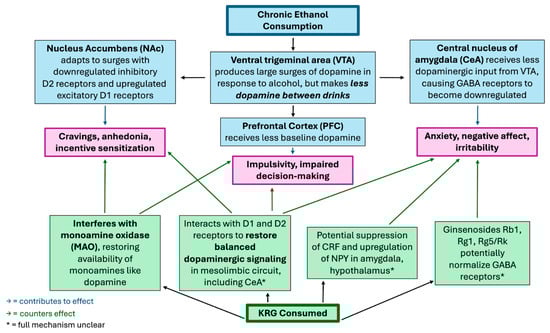 It is worth noting that substance addictions are speculated to develop from alterations to neurotransmission and synaptic plasticity in structures of the mesolimbic pathway of the brain, the same area of the brain affected in the previously mentioned 2014 study [3,4,5,13]. When an addictive substance like alcohol is used chronically, more and more dopaminergic neurons are stimulated to the point where dopamine supply in the mesolimbic reward circuits can become depleted; this depletion causes both increased cravings for the substance and more severe withdrawal symptoms. Thus, a common goal in therapy for substance abuse is restoring normal dopamine function in these circuits [7]. Ginsengs have been cited to have use in treating a plethora of addictions (including cocaine, opiates, psychostimulants, and nicotine) through its modulation of dopaminergic pathways [4,5,6]. Considering this property along with KRG showing the capacity to restore functionality to the dopaminergic mesolimbic pathway in this study on anxiety in rats with EW, there is evidence that KRG has the potential to combat the addictive component of alcohol use disorder. For an overview of how KRG combats the neural effects of chronic alcohol consumption, see Figure 2 below.