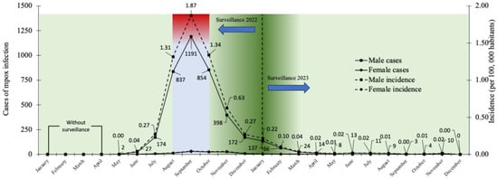 Temporal epidemic curve of confirmed cases and incidence (per 100,000 habitants) by sex of mpox in Mexico during 2022 and 2023.