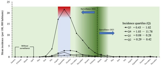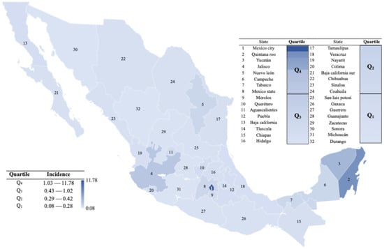 In general, the states with the highest incidence of cases were those located in the center, western Pacific coast and south of the country, bordering countries such as Belize and Guatemala. Furthermore, based on the average state incidences during the study period, states were classified into quartiles (Q1–Q4).