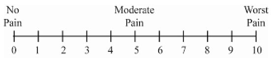 - Collins, S.L.; Moore, R.A.; McQuay, H.J. The visual analogue pain intensity scale: What is moderate pain In milimeters? Pain 1997, 72, 95–97. [Google Scholar] [CrossRef]