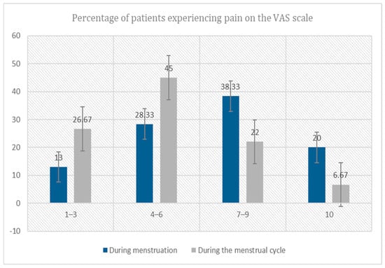 Figure 2 presents an analysis of the results regarding the percentage distribution of pain intensity as assessed using the VAS. During menses, 13% of patients reported mild pain, 28.33% reported moderate pain, 38.33% reported severe pain, and 20% reported excruciating pain. None of the patients in the study group reported an absence of pain symptoms. During the rest of the cycle, 26.67% of patients experienced mild pain, 45% reported moderate pain, 22% reported severe pain, and 6.67% experienced excruciating pain. Again, none of the patients in the study group reported an absence of pain symptoms.