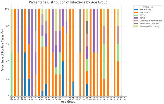 A critical observation from the analysis is the elevated prevalence of positive HIV results in the 20–39 age group, marking this cohort as a priority for targeted health interventions. Specifically, the 40–49 age group exhibited the highest HIV prevalence at 76.47%, followed closely by the 30–39 age group at 66.67%, with a significant presence in the 20–29 group at 37.50% [45,46]. Conversely, older age groups (50+) displayed significant gaps in testing across multiple diseases, underscoring the urgent need for improved diagnostic coverage and health service accessibility for this demographic [44,47]. The disparities in testing practices and disease prevalence across age groups highlight a critical area for public health initiatives aimed at reducing STI transmission and improving overall health outcomes [43].