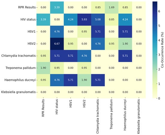 Conversely, low or zero co-occurrence rates were observed for RPR test results for syphilis, which rarely overlapped with other diseases. Similarly, Klebsiella granulomatis showed no co-occurrence across all conditions in the dataset, suggesting that these infections may have distinct epidemiological profiles that do not frequently intersect [56]. This lack of overlap emphasizes the importance of targeted screening and prevention strategies for these specific infections.