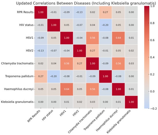 The correlation analysis of STIs in Figure 3 revealed key patterns of disease co-occurrence and independence. The color gradient (from deep red to deep blue) corresponds to the Pearson correlation coefficients between STI pathogens. Positive correlations (closer to +1) are shown in red shades, negative correlations (closer to −1) in blue shades, and neutral/no correlation (around 0) appear in white or light tones. Strong positive correlations were observed between HSV-1 and Haemophilus ducreyi (0.64), Chlamydia trachomatis and HSV-1 (0.56), and Chlamydia trachomatis and Haemophilus ducreyi (0.56), suggesting shared transmission routes and behavioral risk factors such as unprotected sexual contact. Additionally, HSV-2 and Chlamydia trachomatis (0.27) showed a moderate correlation, indicating potential overlap due to common transmission pathways. Conversely, weak or negative correlations were noted between HIV status and Treponema pallidum (−0.20) and RPR results and HSV2 (−0.13), indicating that these infections do not frequently co-occur, possibly due to differing risk factors, testing interventions, or distinct transmission dynamics. Minimal relationships were found between HIV status and other STIs, as well as Treponema pallidum and other diseases, suggesting these infections often occur independently. Klebsiella granulomatis exhibited nearly zero correlation with all other infections, reinforcing its rarity in this study population and the distinct epidemiology of donovanosis. These findings underscore the importance of integrated diagnostic strategies for strongly correlated infections while emphasizing the need for targeted screening and prevention efforts for infections with independent transmission patterns.