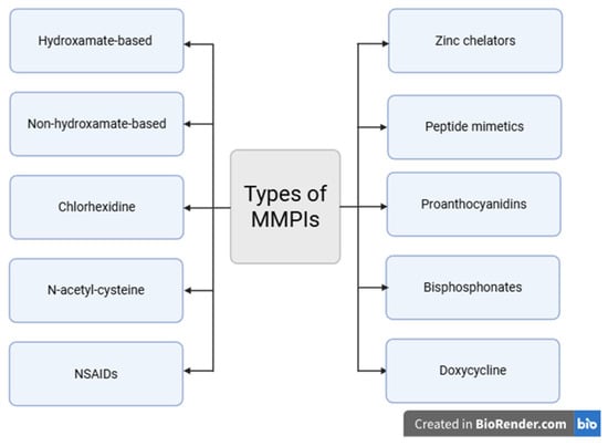 Membrane-type matrix metalloproteinases (MT-MMPs) belong to a subgroup of the matrix metalloproteinase (MMP) family, distinguished by their location in the cell membrane. These enzymes play roles in the restructuring of the extracellular matrix and the regulation of physiological and pathological processes. Currently, six MT-MMPs have been identified, divided into two categories, namely membrane-type (MT-1, 2, 3, and 5 MMPs), which have an intracellular domain and a transmembrane region that anchors them to the plasma membrane, and glycosylphosphatidylinositol-anchored type (MT-4 and 6 MMPs), which are linked to the membrane via glycosylphosphatidylinositol. MT-MMPs are involved in ECM degradation, the activation of other MMPs, and the regulation of cellular processes. MT1-MMP plays a crucial role in osteoclastic activity, facilitating bone matrix degradation during bone restoration [15]. This review aimed to provide an overview of the various types of MMP inhibitors (MMPI), their properties, and mechanisms of action that could be evaluated and applied in the treatment of periodontitis.