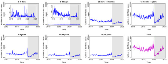 Number of diarrhoea cases among children in several age groups and in the total child population in Jakarta, Indonesia. Notes: The white and grey areas show Period 1 (before the COVID-19 pandemic) and Period 2 (during and after the COVID-19 pandemic), respectively.