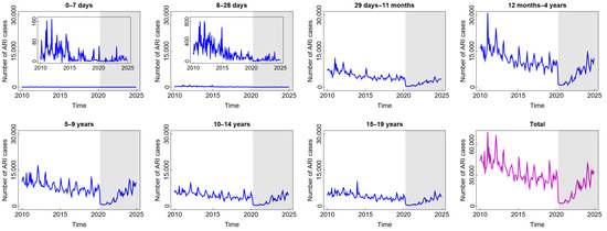 Compared to diarrhoea and DHF, ARI is the most common disease experienced by children in all age groups. From Figure 3, we find that the highest number of total ARI cases in the last 15 years was almost 70,000. The incidence decreased slowly before COVID-19 and then decreased significantly at the beginning of the COVID-19 outbreak. The reason for this phenomenon was similar to the sharp decrease in diarrhoea cases during such a short period. However, the incidence gradually increased from 2022 to 2025 after the new normal phase began to be implemented. Children aged 12 months to 4 years were the group with the highest number of ARI cases. This was also related to the highest mortality rate in children under five due to respiratory infections.