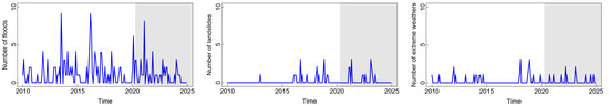 This research focuses on the Province of the Special Region of Jakarta and considers disasters that occurred in the area from January 2010 to December 2024. In particular, we consider the monthly occurrence of three disasters believed related to climate change: floods, landslides, and extreme weather events; see their recent distributions in Figure S2 in the Supplementary Materials. BNPB classifies various floods under code 101, including coastal floods, flash floods, drainage and trench floods, reservoir floods, stagnant floods, and breaches of levees. Landslides and soil movement are classified as landslide disasters under code 102. Extreme weather events, such as tornadoes, strong windstorms, hurricanes, hailstorms, tropical cyclones, and significant temperature fluctuations, fall under category 104. The Head of BNPB regulates naming conventions and codes for other disaster events in accordance with the Technical Guidelines for Standard Data on Disaster Events and Impacts (Number 7 of 2023) [36].
