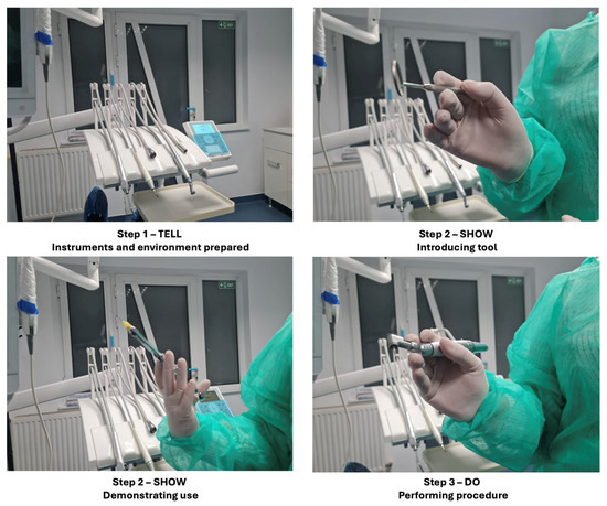 Participants in this group underwent the widely used tell–show–do technique, a standard behavior management strategy in dentistry, as shown in Figure 2.