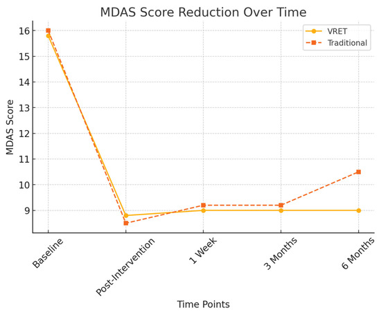Statistical analyses confirmed that both groups exhibited significant reductions in MDAS scores from baseline to immediately post-intervention (VRET: p < 0.001, Traditional: p < 0.001). However, the VRET group demonstrated superior retention of reduced anxiety levels at the six-month follow-up, with scores remaining statistically lower than their baseline (p = 0.002, 95% CI [5.9, 7.2], Cohen’s d = 0.65), indicating a moderate to strong effect. In contrast, the traditional group exhibited a mild regression in anxiety reduction at six months (p = 0.048, 95% CI [5.3, 6.7], Cohen’s d = 0.41), suggesting a less sustained impact over time. These results support the hypothesis that VRET is more effective in maintaining long-term reduction in dentophobia among digitally inclined individuals.