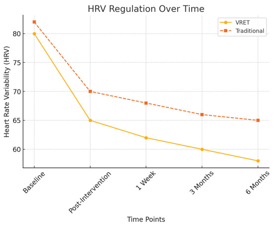 - Post-intervention HRV: Both groups exhibited a significant reduction in physiological stress markers (p < 0.01), but Group A (VRET) maintained lower stress responses at six months, indicating superior long-term anxiety regulation.