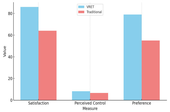 Figure 7 illustrates a comparison of participant satisfaction, perceived control, and method preference between the VRET and traditional intervention groups.