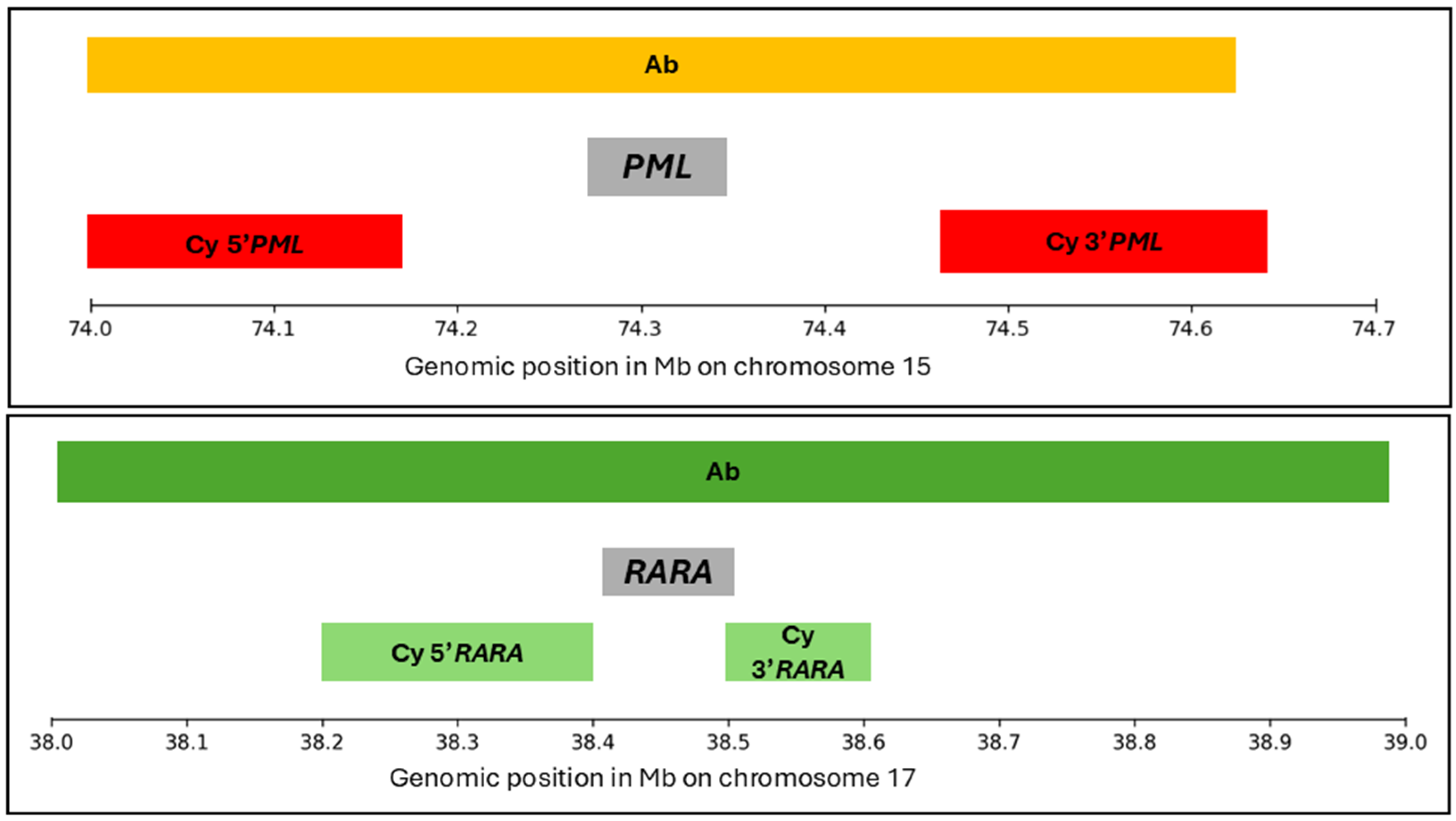 - ASR Vysis LSI PML/RARA Dual Color, Dual Fusion Translocation Probe. Available online: https://www.molecular.abbott/int/en/chromosome-main/15 (accessed on 2 November 2025).