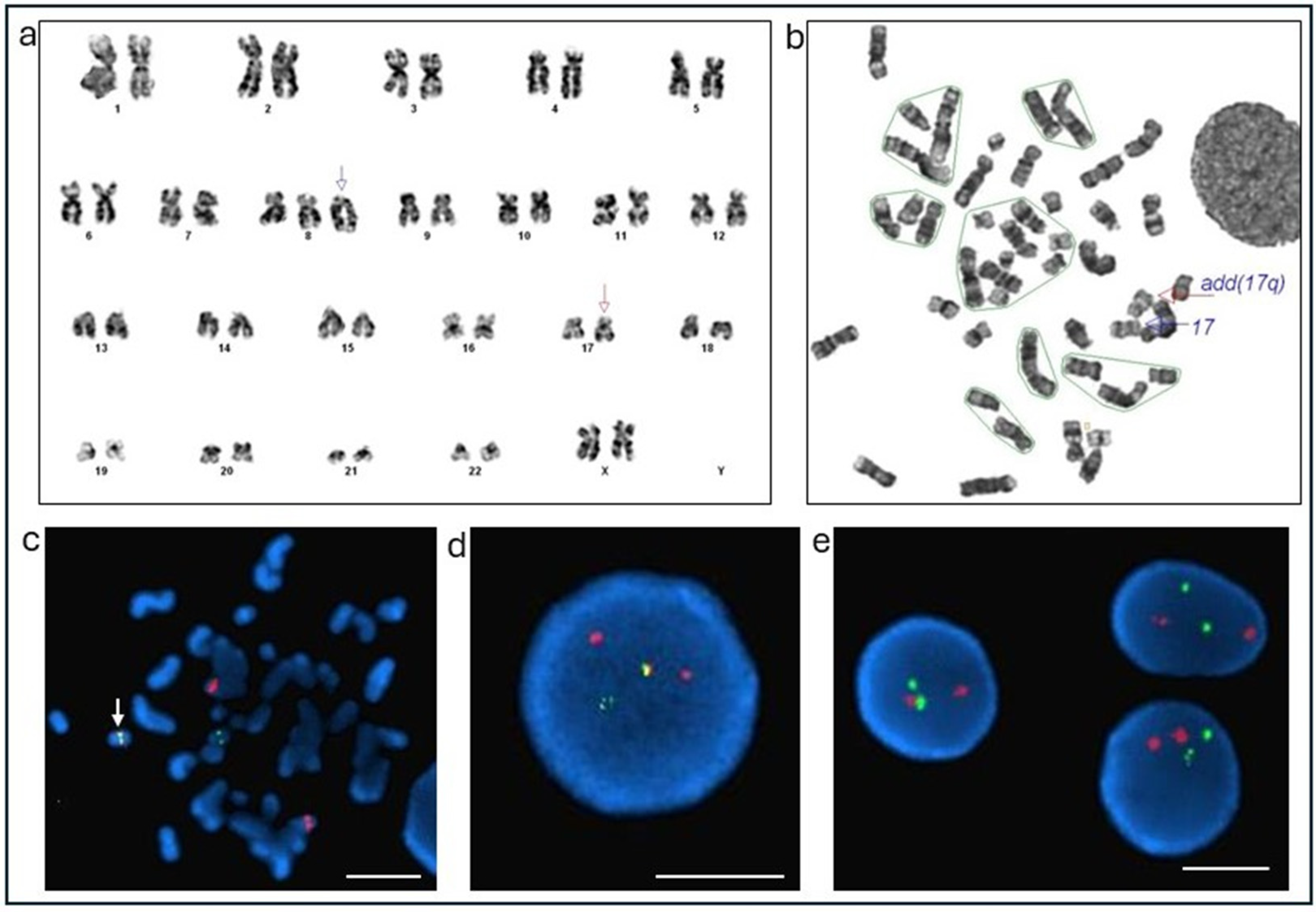 | 7 (Case 1) | Karyotype: 47,XX,+der(8)add(8)(p11.2)dup(8)(q13q22),add(17)(q21)[cp9]/46,XX[11] FISH | |