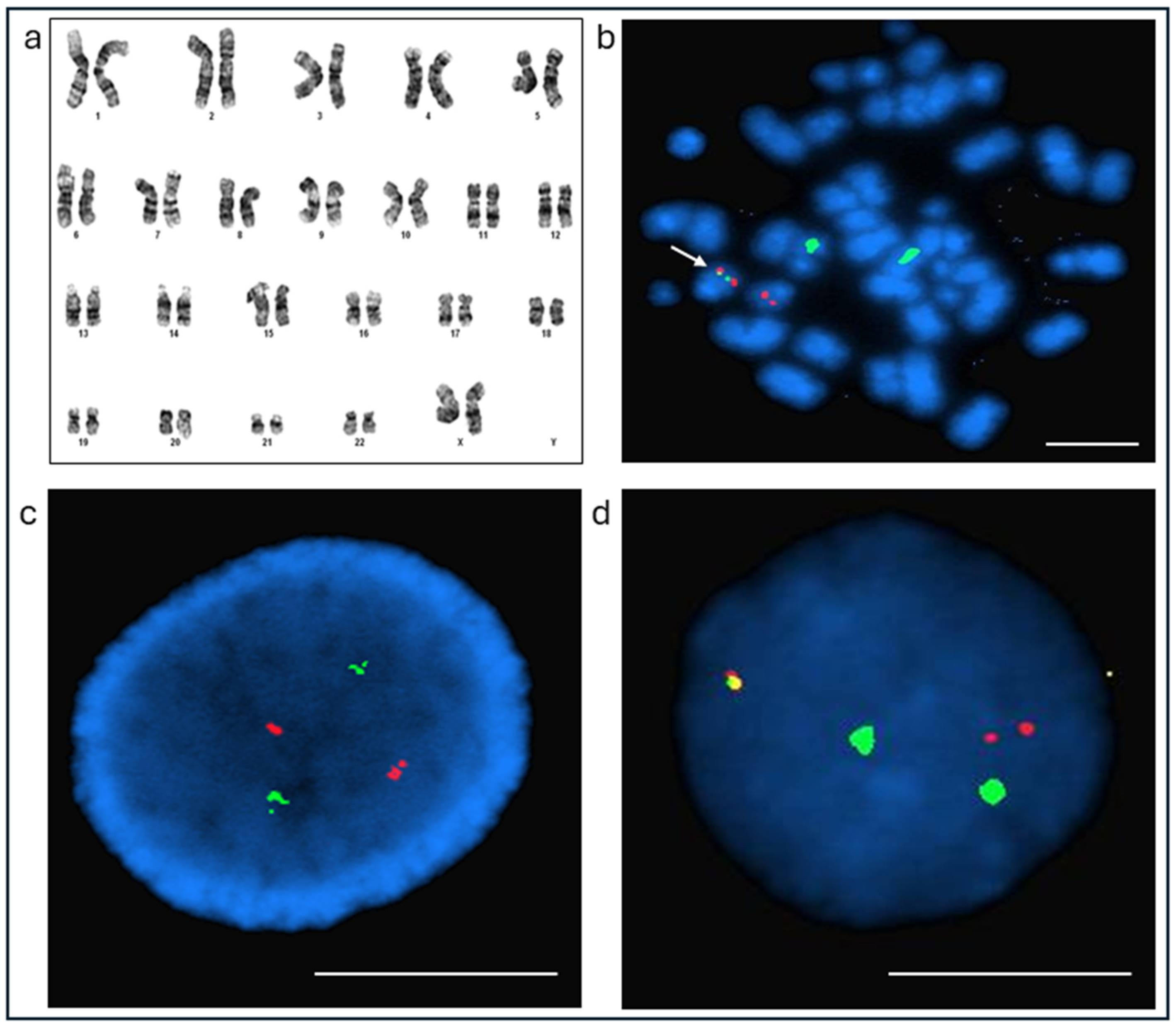 - Campbell, L.J.; Oei, P.; Brookwell, R.; Shortt, J.; Eaddy, N.; Ng, A.; Chew, E.; Browett, P. FISH detection of PML-RARA fusion in ins(15;17) acute promyelocytic leukaemia depends on probe size. Biomed. Res. Int. 2013, 2013, 164501. [Google Scholar] [CrossRef]