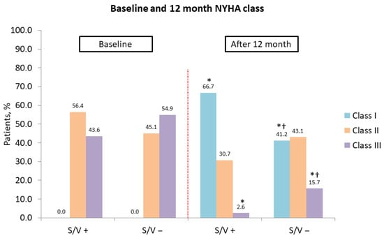Association of cardiac resynchronization therapy and sacubitril/valsartan with improvement in New York Heart Association class at 12 months. NYHA, New York Heart Association; S/V +, cardiac resynchronization therapy with sacubitril/valsartan treatment; S/V −, cardiac resynchronization therapy without sacubitril/valsartan treatment; *, p < 0.001 for baseline vs. 12-month comparison; †, p < 0.05 for within-group change from baseline.