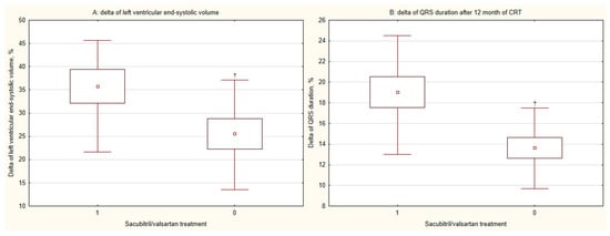 Echocardiographic parameters improved significantly in both groups, with LVEF increasing and left ventricular end-systolic volume (LVESV) decreasing (both p < 0.001) (Figure 2C,D). While the change in LVEF (∆LVEF) was not significantly different between groups (p = 0.079), the reduction in LVESV (∆LVESV) was significantly greater in the sacubitril/valsartan group (p = 0.025) (Figure 4A).