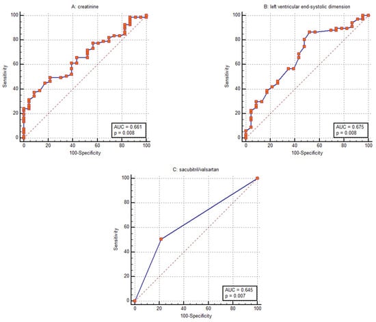 Receiver operating characteristic curves for discriminating response to cardiac resynchronization therapy using (A) baseline creatinine level, (B) baseline left ventricular end-systolic dimension and (C) sacubitril/valsartan treatment.