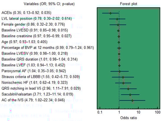 Forest plot for the univariable logistic regression results. AC, asynchronous contraction; ACEIs, angiotensin-converting enzyme inhibitors; AF, atrial fibrillation; BVP, biventricular pacing; CI, confidence interval; IVS, interventricular septum; HF, heart failure; LBBB, left bundle branch block; LVL, left ventricular lead; LVEF, left ventricular ejection fraction; LVESD, left ventricular end-systolic dimension; LVESV, left ventricular end-systolic volume; OR, odds ratio.