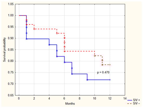 Kaplan-Meier analysis of arrhythmic events recorded by the cardiac resynchronization therapy device between groups with and without sacubitril/valsartan treatment. S/V +, cardiac resynchronization therapy with sacubitril/valsartan treatment; S/V −, cardiac resynchronization therapy without sacubitril/valsartan treatment.