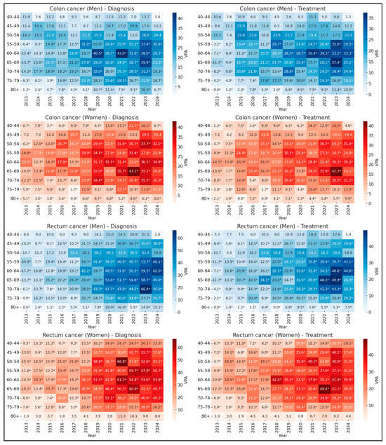 Annual Percent Change (APC) in the diagnosis and treatment of colon (C18) and rectal (C20) cancer, by age group and sex, Brazil, 2013-2024. Legend: Heatmaps depict the Annual Percent Change (APC) for diagnosis (left panels) and treatment (right panels). The APC represents the average annual percent change in age-adjusted rates. Darker shades indicate higher APC values. Each cell displays the APC for the corresponding year and age group. An asterisk (*) denotes a statistically significant temporal trend (p < 0.05) according to Prais-Winsten regression.