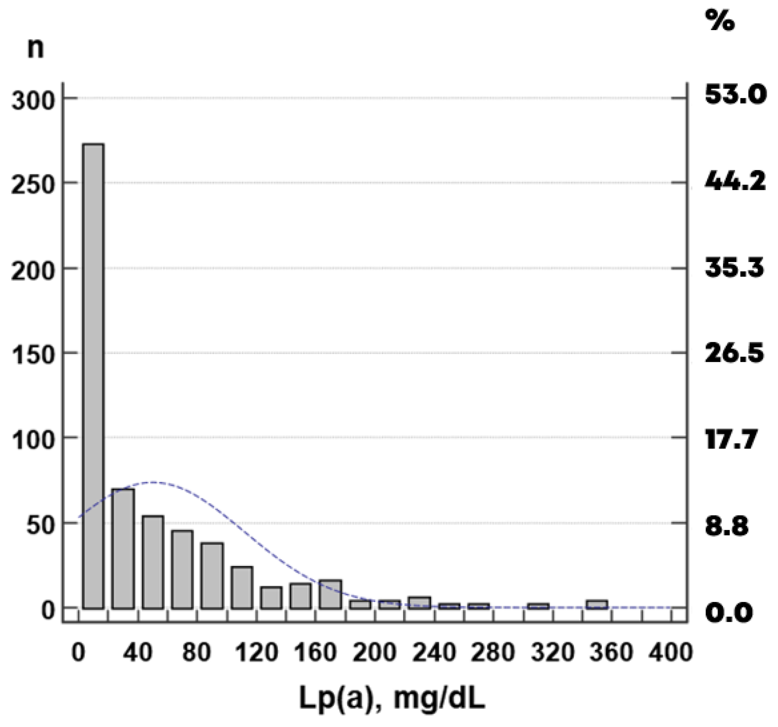 In our study, which included patients with early manifestation of CHD, 45% of the sample had an elevated Lp(a) concentration > 30 mg/dL. Moreover, the contribution of Lp(a)-C to LDL-C, and hence the error in the determination of LDL-C concentration and the possibility of reclassification, was particularly pronounced higher in the range, up to 2.6 mmol/L. This is especially important for high-risk patients, because for them, intensification of standard lipid-lowering therapy will not lead to achievement of target LDL-C levels. In the largest study of the prevalence of elevated Lp(a) concentrations in the USA (