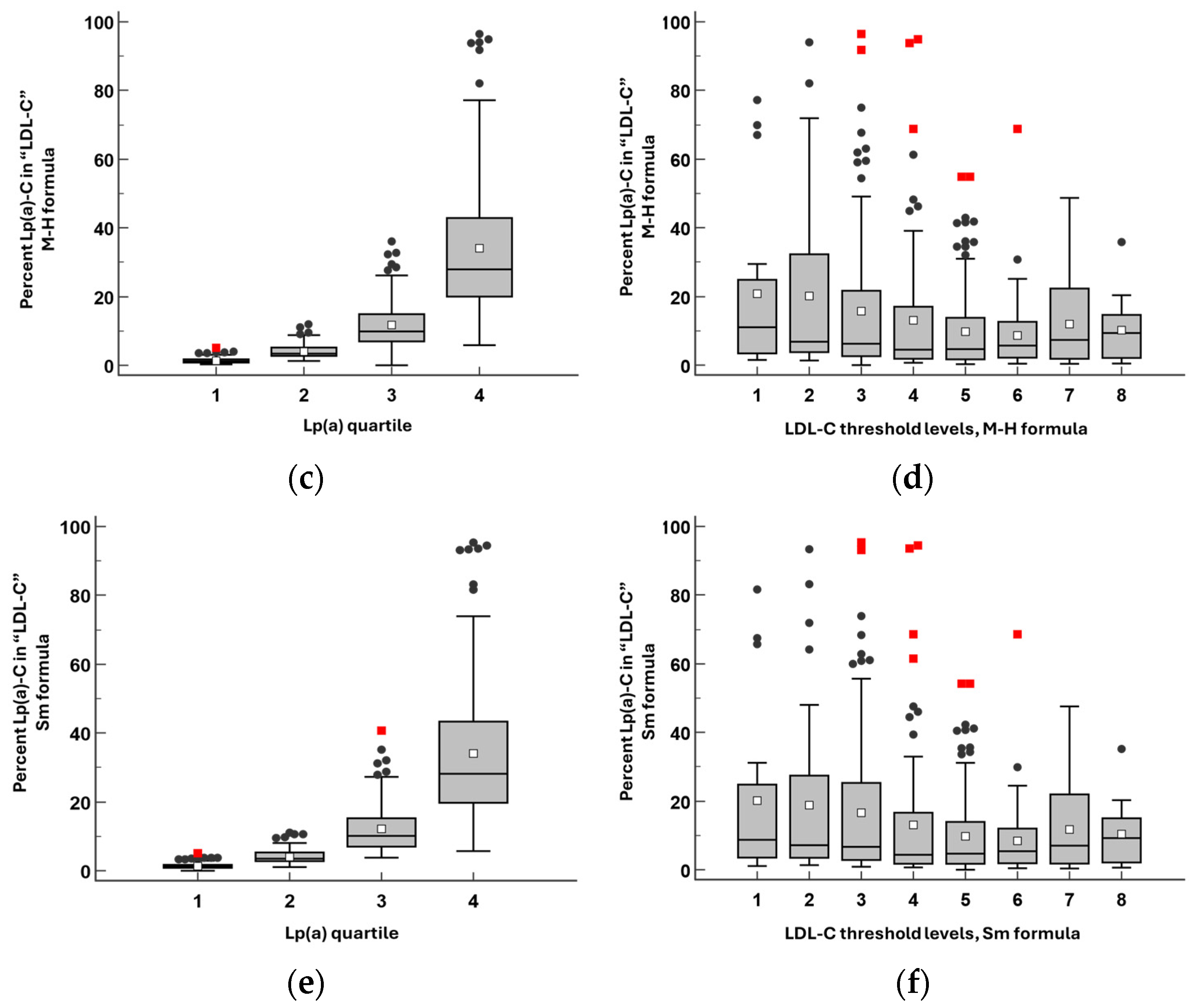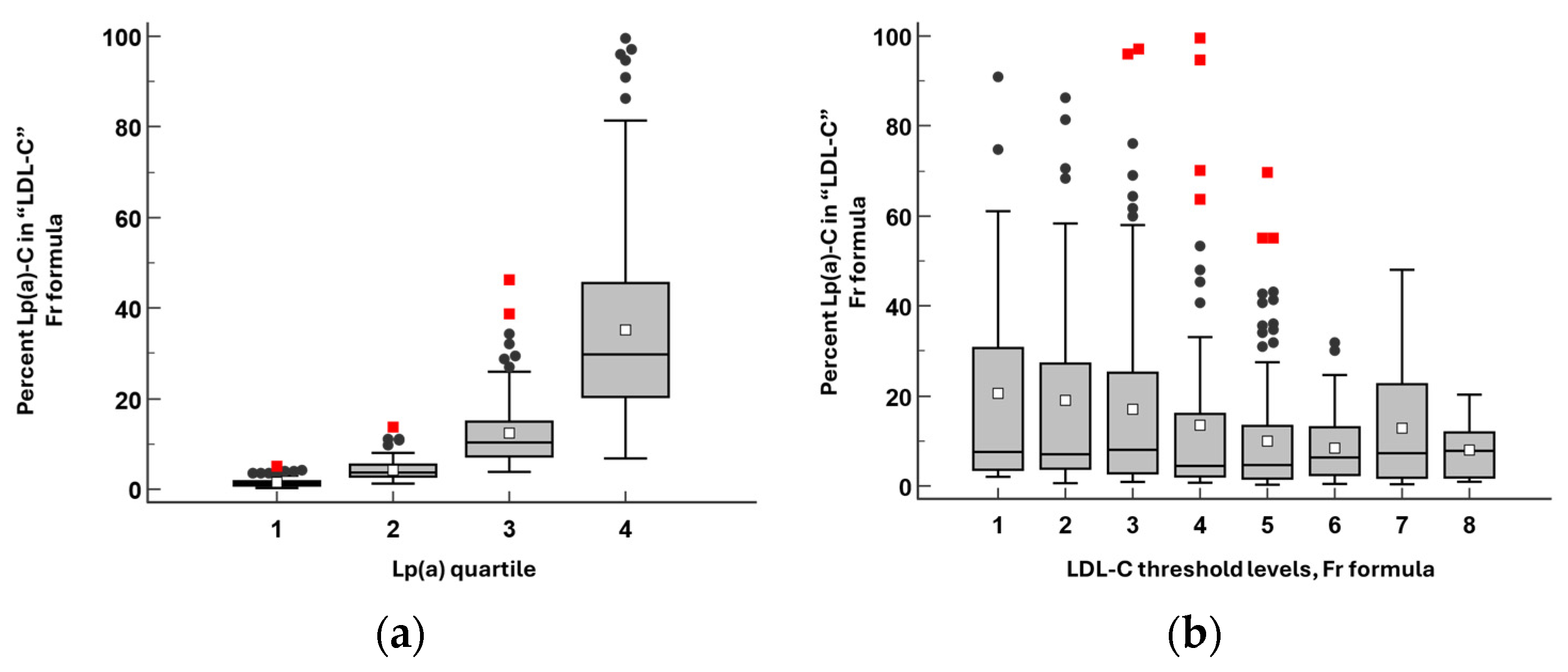 Thus, the issue of achieving the “target level” of LDL-C in patients with elevated Lp(a) concentration becomes extremely relevant, but there has been an ongoing debate about the correctness of determination of LDL-C in these patients up to now. From a clinical perspective, this may lead to misclassification of goal attainment and potentially inappropriate treatment decisions: LDL-C can appear above guideline-recommended thresholds because it includes the cholesterol carried by Lp(a), particularly in patients receiving intensive lipid-lowering therapy where LDL particles are reduced but Lp(a) remains unchanged. Therefore, separating the LDL-particle cholesterol from the Lp(a)-cholesterol component could improve the clinical interpretation of whether a patient has truly achieved the LDL-C target and may help clinicians better judge residual risk attributable to Lp(a). We hypothesized that (i) Lp(a) correction would systematically shift patients to lower LDL-C categories (“down-classification”), and (ii) the magnitude of reclassification would differ across commonly used LDL-C equations (Friedewald, Martin–Hopkins, and Sampson), particularly in strata with elevated Lp(a). Accordingly, this study aimed to quantify how Lp(a) affects LDL-C calculated by different equations and to estimate the extent of clinically relevant reclassification across LDL-C thresholds.