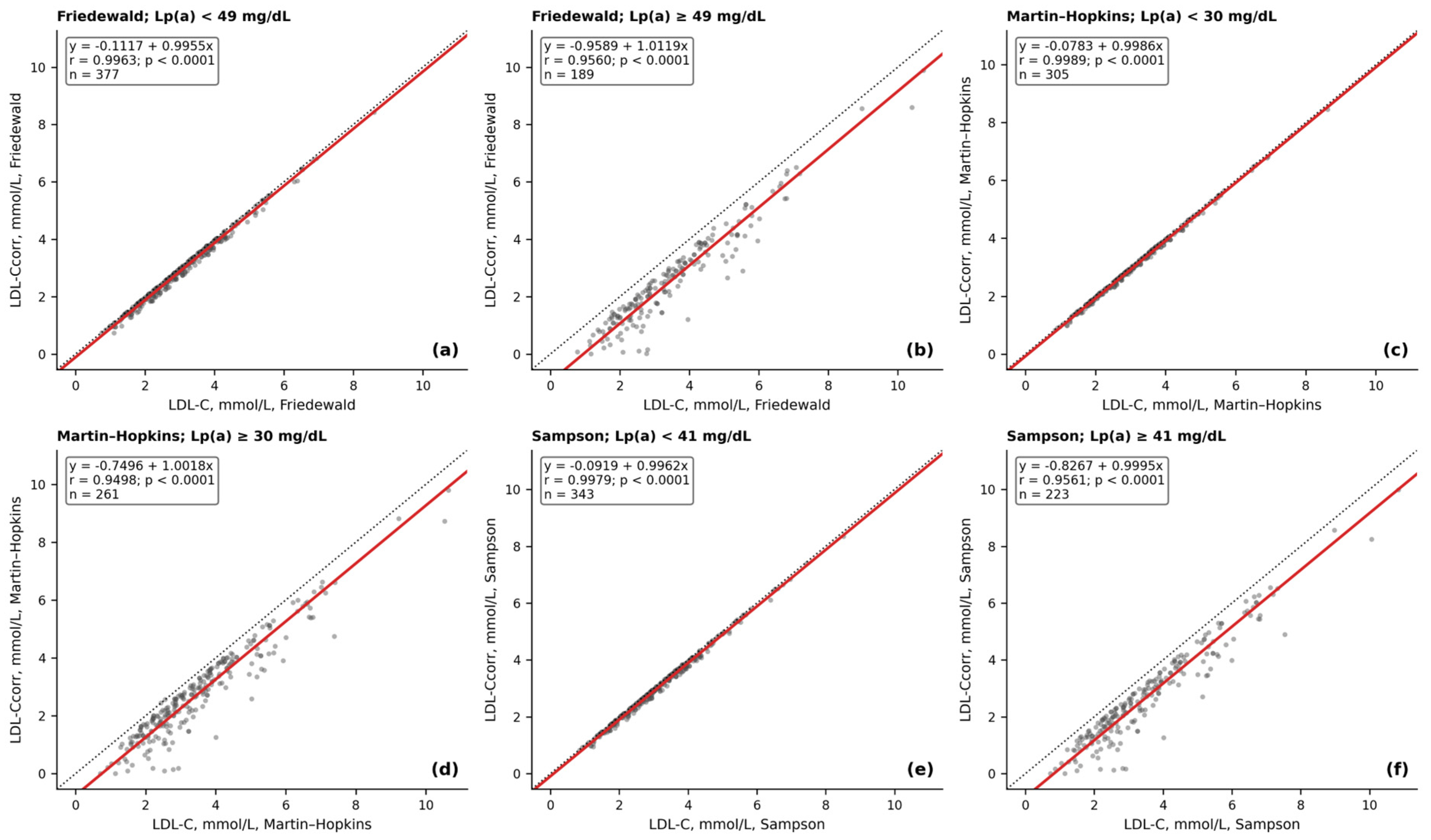 Lin’s concordance correlation coefficient (CCC) between LDL-C and LDL-Ccorr showed moderate agreement for all three formulas: Friedewald (CCC = 0.904; 95% CI, 0.887–0.918), Martin–Hopkins (CCC = 0.908; 95% CI, 0.892–0.921), and Sampson (CCC = 0.910; 95% CI, 0.894–0.923). The moderate agreement (rather than almost-perfect agreement) reflects the systematic difference introduced by Lp(a) correction, with mean reductions of approximately 0.39 mmol/L (SD: 0.47 mmol/L). Cross-formula comparisons showed substantial-to-almost-perfect agreement, both before and after Lp(a) correction. Martin–Hopkins and Sampson formulas demonstrated almost perfect agreement (CCC = 0.998 for LDL-C; CCC = 0.997 for LDL-Ccorr), while Friedewald showed substantial agreement with both formulas (CCC > 0.97).
