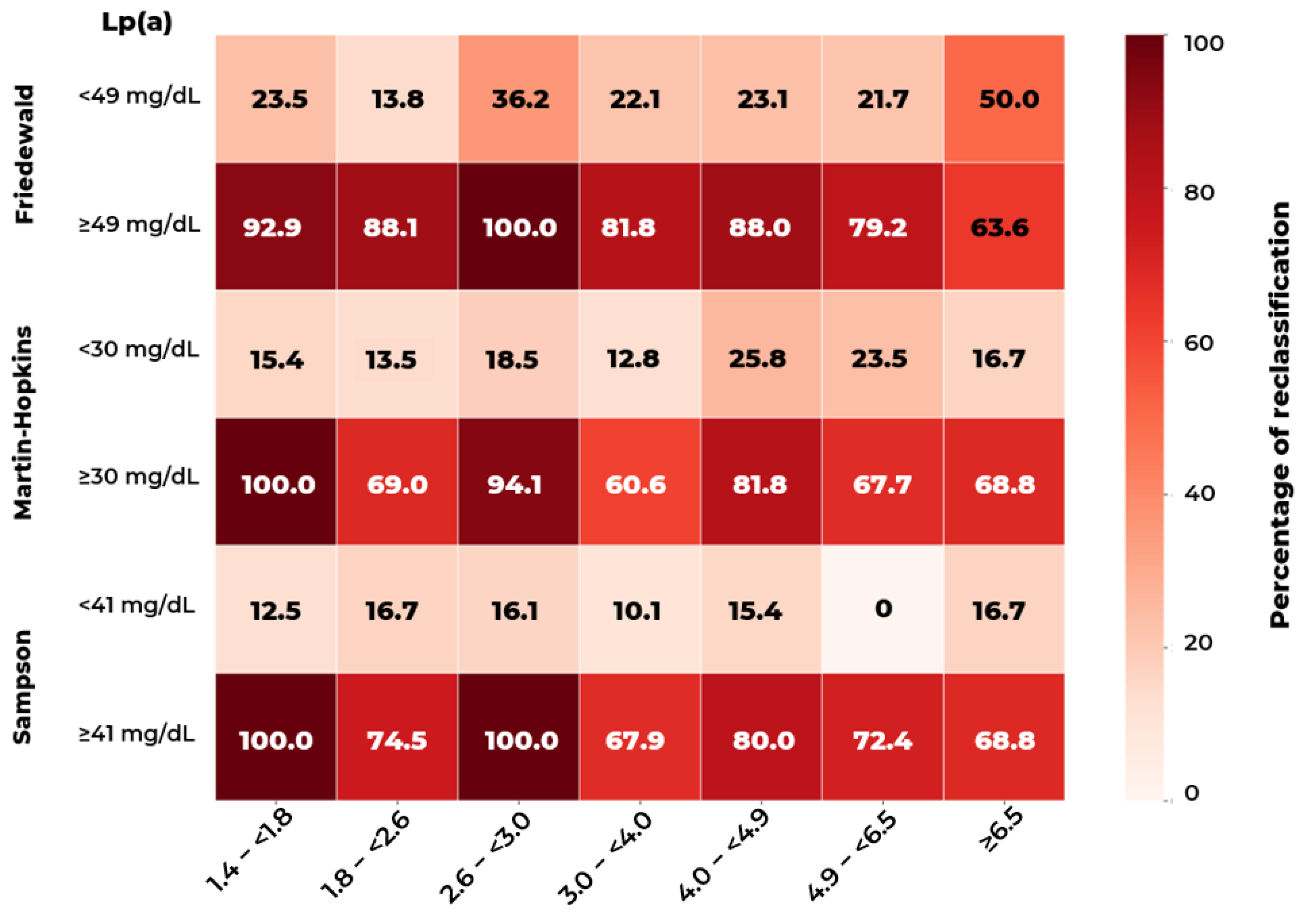 When stratified by clinically significant LDL-C thresholds calculated using different equations and considering Lp(a)-C, the proportion of values reclassified to a lower LDL-C category ranged from 30 to 59% (