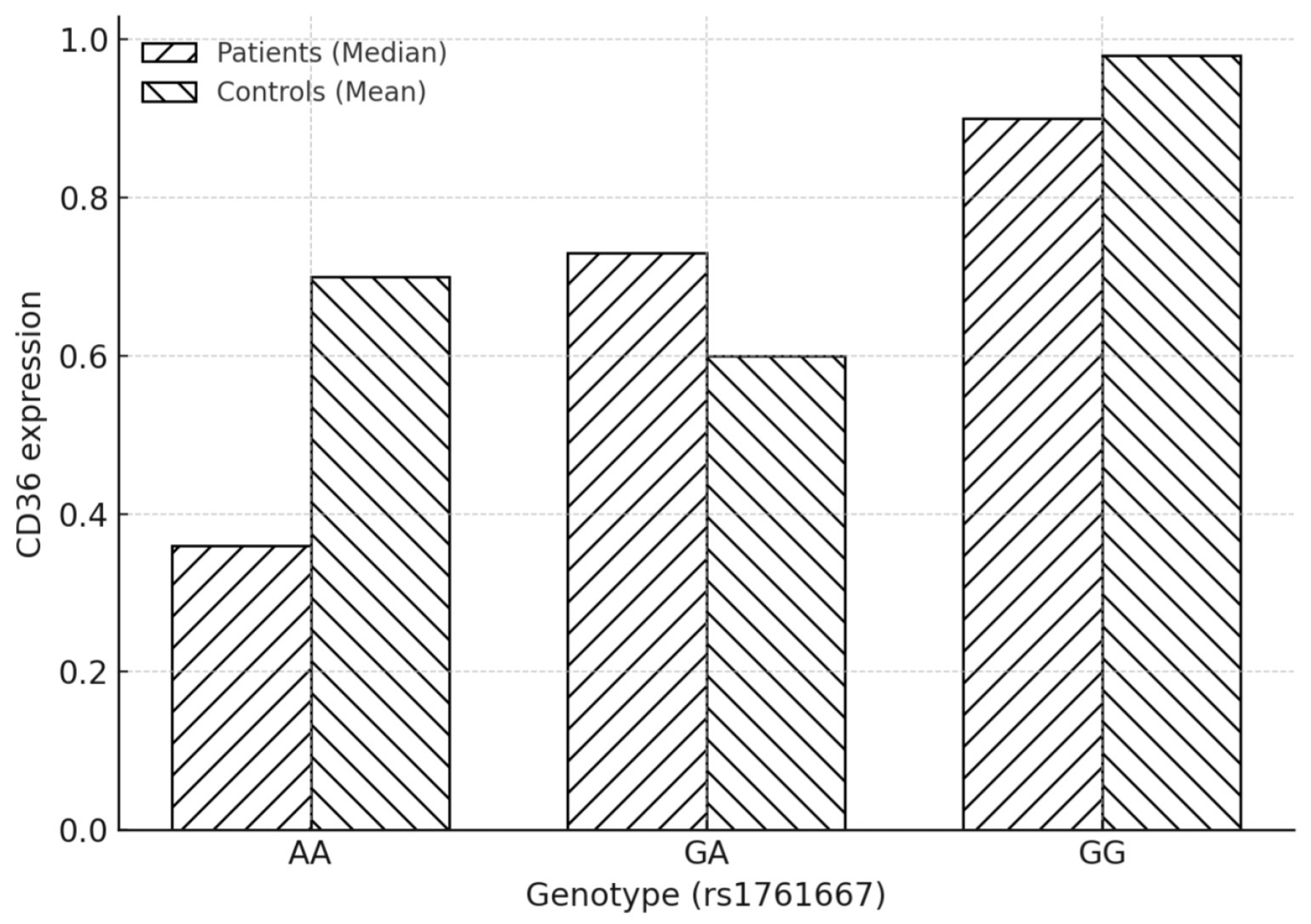 | Genotype | Patients n = 30 (%) | Controls n = 19 (%) | CD36 Expression (Patients) Median (IQR) | CD36 Expression (Controls) Median (IQR) |