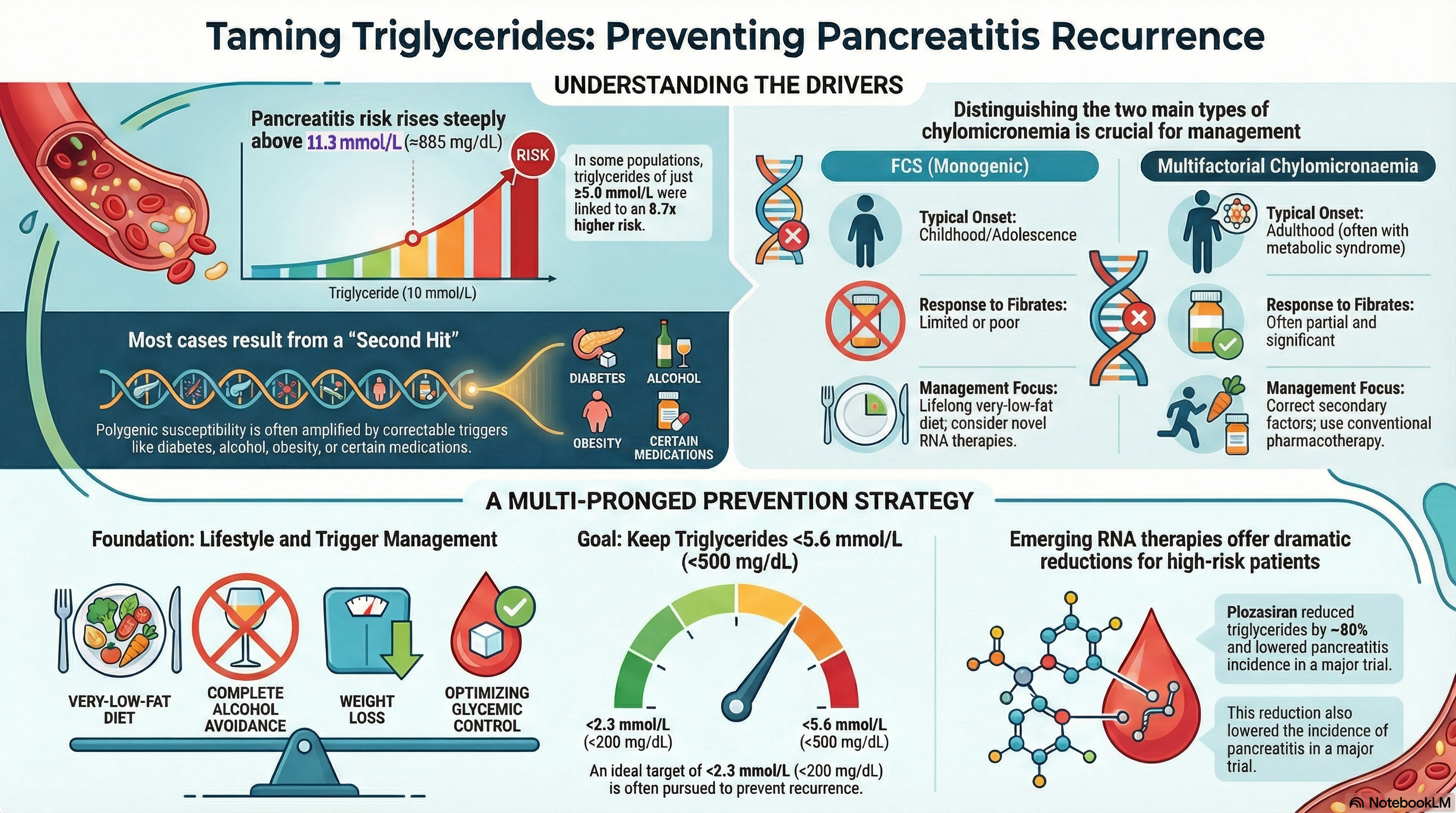 | Management emphasis | Very-low-fat diet lifelong; consider apoC-III/siRNA therapies when available | Correct secondary factors; pharmacotherapy (fibrates, omega-3, statins if indicated); consider emerging therapies for persistent high-risk cases |