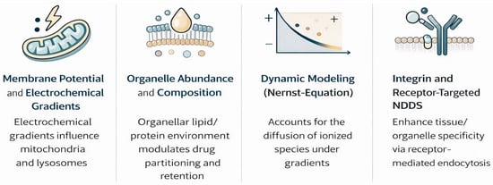 Drug distribution is further modified by organelle abundance, composition, and membrane potential gradients across mitochondria/lysosomes [28,29]. Recent Nernst–Planck models incorporating electrochemical gradients have improved the prediction of ionized species diffusion [30,31].