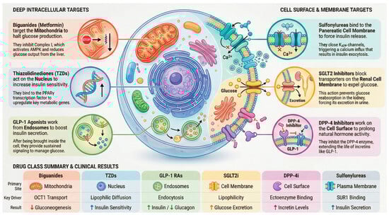 Antidiabetic drugs encompass diverse classes with distinct mechanisms of action; accordingly, they exhibit different patterns of subcellular distribution. Understanding the intracellular localization of these drugs that enter target cells (and what they do there) helps explain their therapeutic effects and side-effect profiles. This section reviews the major classes of antidiabetic drugs, including biguanides, sulfonylureas (and meglitinides), thiazolidinediones, SGLT2 inhibitors, DPP-4 inhibitors, and GLP-1 receptor agonists, highlighting key findings about their intracellular PK. The subcellular localization and pharmacodynamic effects of each class are summarized in Table 3.