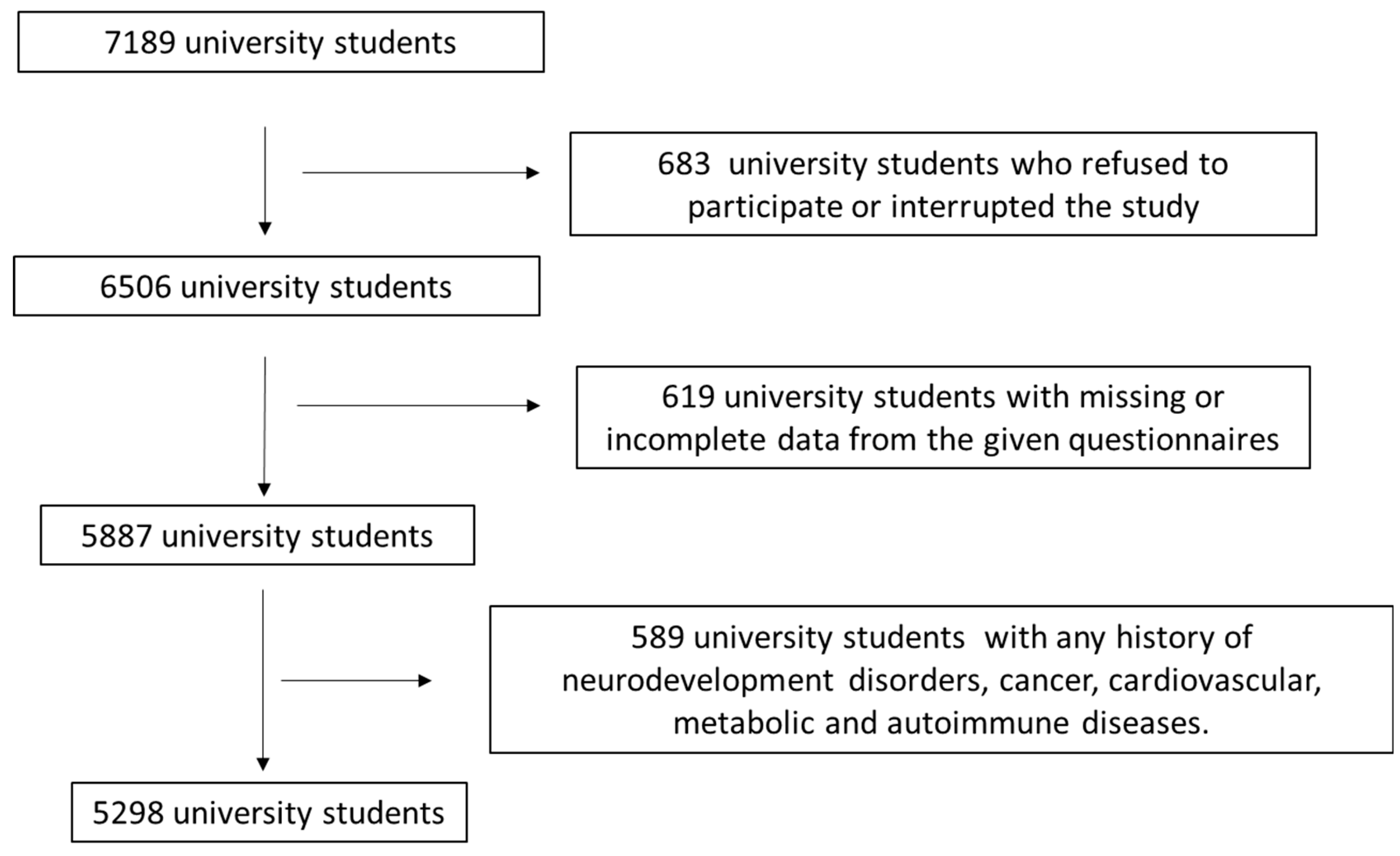 - Akhtar, P.; Ma, L.; Waqas, A.; Naveed, S.; Li, Y.; Rahman, A.; Wang, Y. Prevalence of depression among university students in low and middle income countries (LMICs): A systematic review and meta-analysis. J. Affect. Disord. 2020, 274, 911–919. [Google Scholar] [CrossRef]