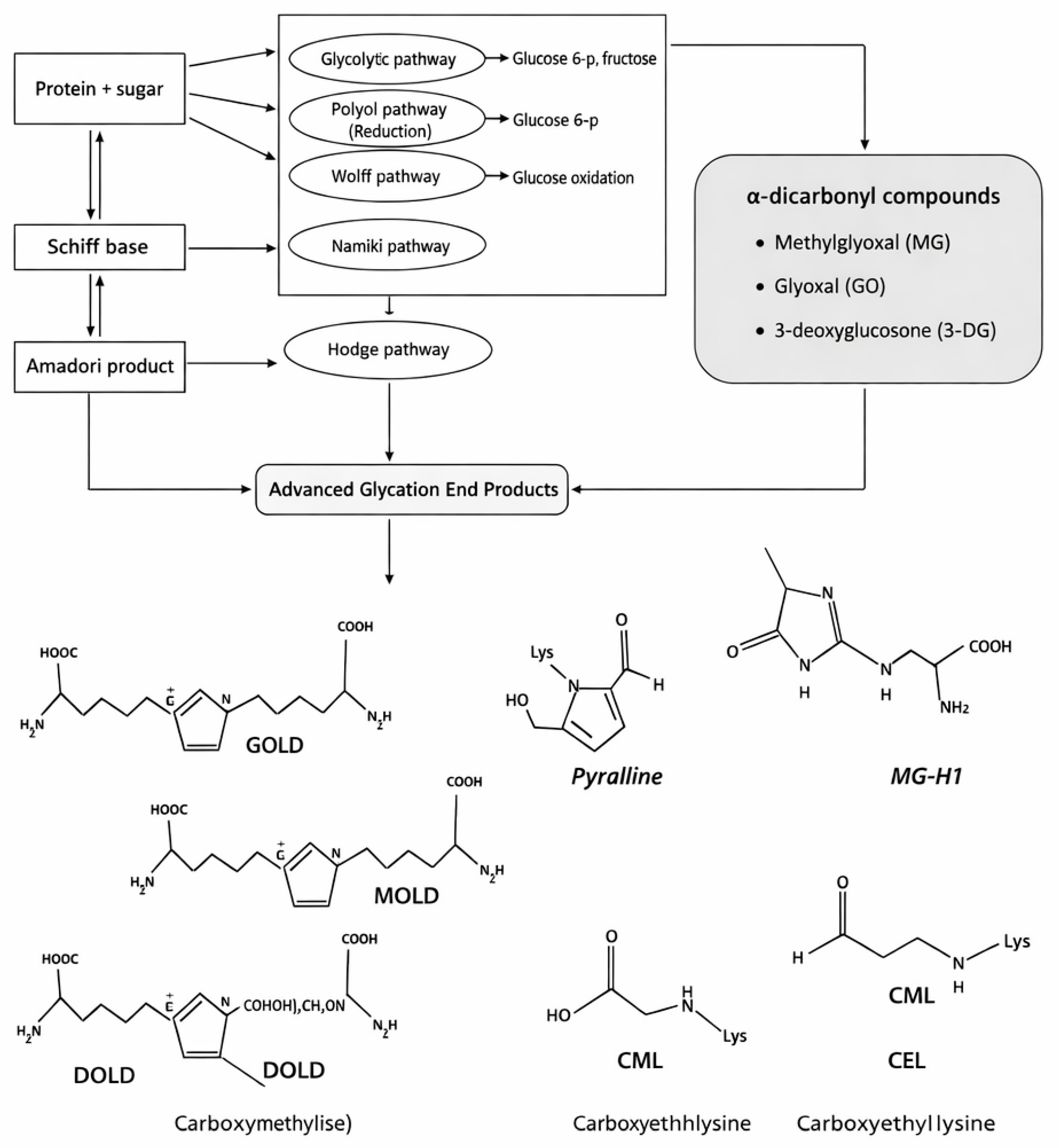 - Malik, P.; Rani, R.; Mukherjee, T.K. The Biology of Advanced Glycation End Products. In Glycosylation and Glycation in Health and Diseases; Bentham Science Publishers: Sharjah, United Arab Emirates, 2025. [Google Scholar] [CrossRef]