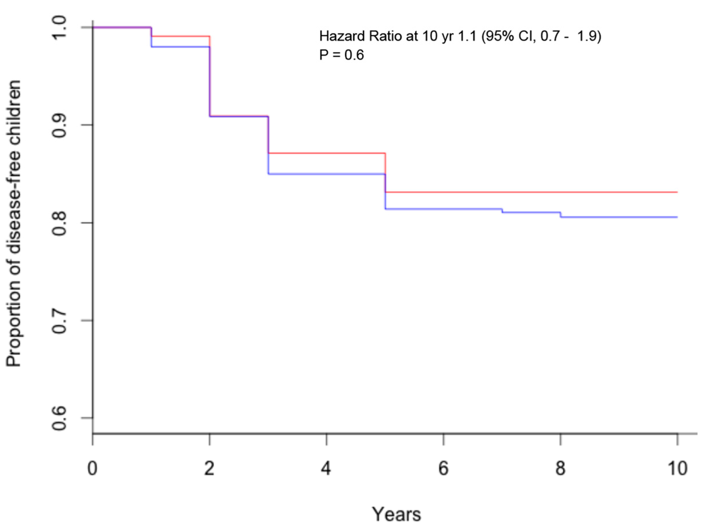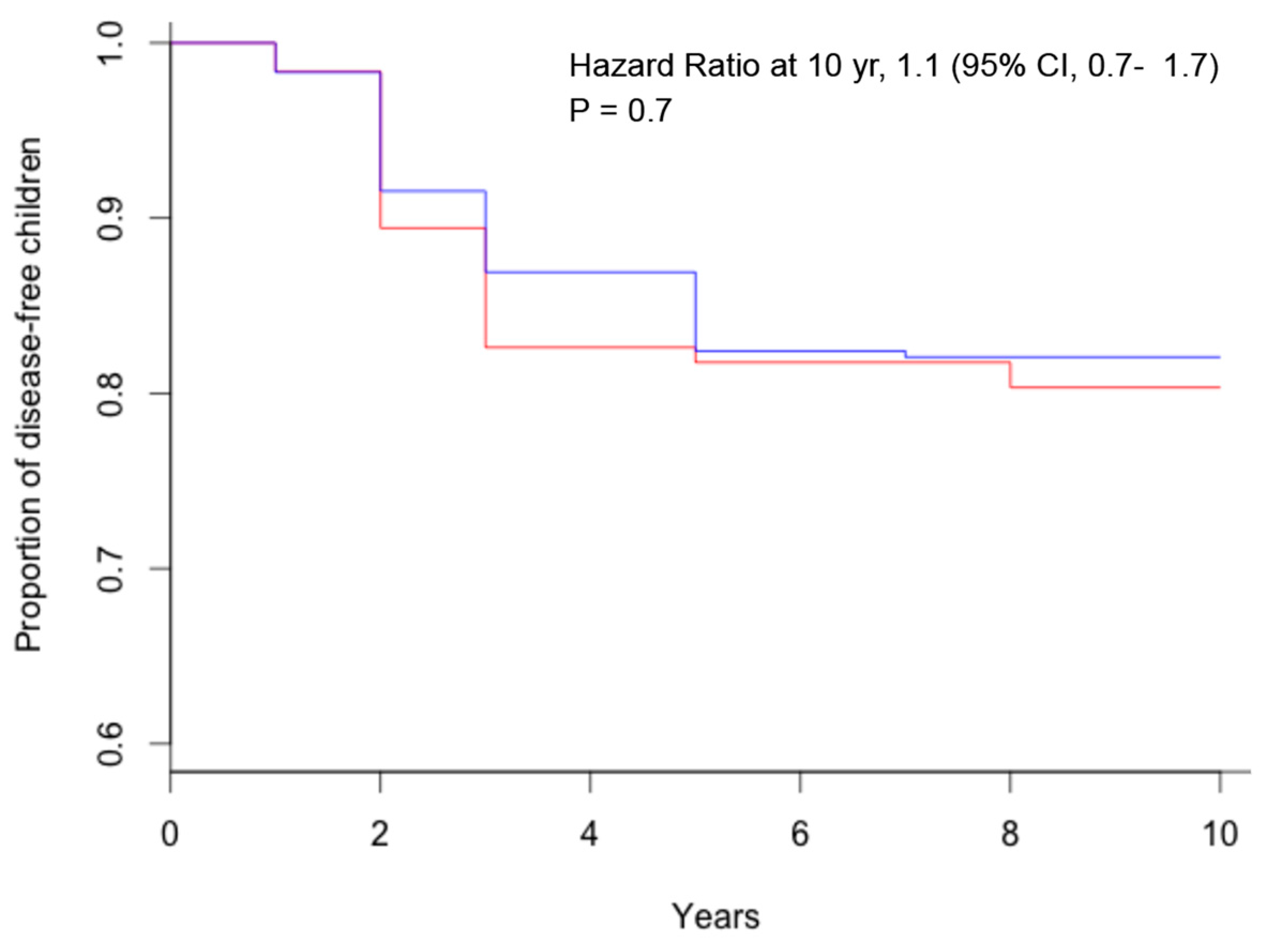 Kaplan–Meier estimates of celiac disease, according to breastfeeding during gluten introduction (red = breastfeeding during gluten introduction; blue = no breastfeeding during gluten introduction).