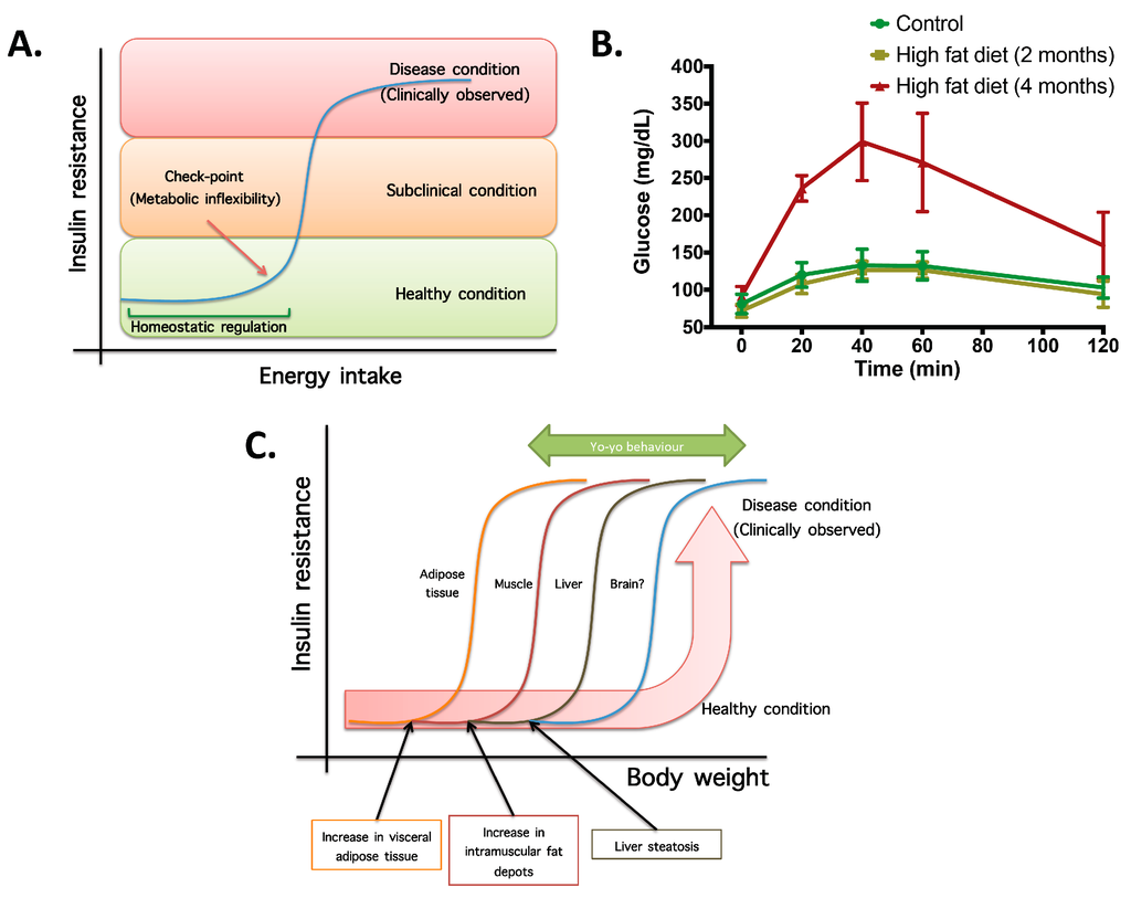 - Not all organs and systems respond in a similar way to an increase or decrease in energy availability. Differences are observed in insulin sensitivity in different organs during the development from an insulin resistance stage to a clinically type 2 diabetes stage. It seems that the onset of type 2 diabetes or other clinical complications are a consequence of the increase in the number of organs with reduced insulin sensitivity. In the clinical setting, it is common to observe a rapid shift from a non-pathological (subclinical) to a disease condition (Figure 1A) that is triggered after exceeding a metabolic checkpoint where the organism is unable to maintain homeostasis. For example, Figure 1B shows that the intake of a high-fat diet in mice is well regulated after two months, until a possible accumulation of factors that triggers a disease condition observed at Month 4 with a clinically-observed feature (unpublished observations); suggesting that, at a certain point, the homeostatic compensation is overwhelmed, and pathological conditions could be observed. Even though, it is interesting to note in the same Figure 1B that at four months of a high-fat diet, the basal glucose levels are the same, although the organism is unable to maintain normal glycemia levels; implying that, in stress conditions (glucose overload), the capacity of the system to rapidly maintain homeostasis is compromised; albeit, finally, a homeostatic condition is reached (fasting state).
