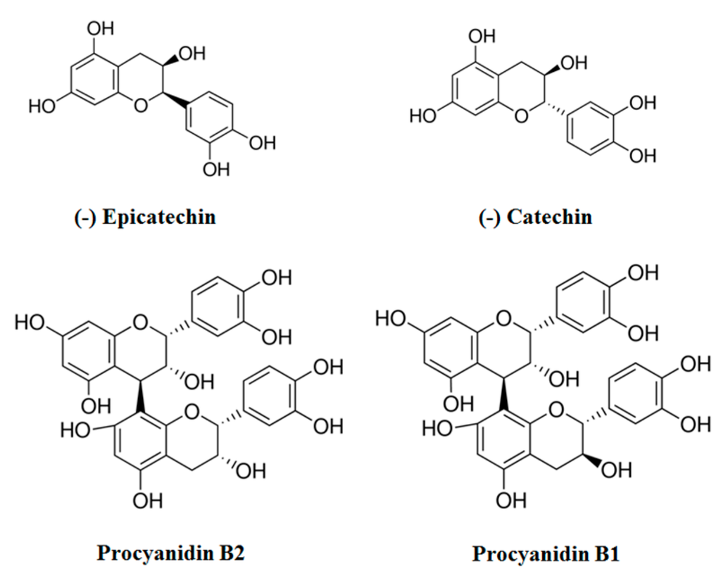 Main flavonoids present in fermented cocoa. Chemical structures of (−)-epicatechin and (−)-catechin and their respective dimmers, procyanidins B2 and B1.