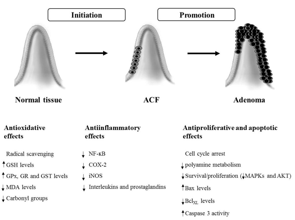 In another study, male Wistar rats were fed with a cocoa-enriched diet (12%, which according to the body surface area normalization method [40] would correspond to a daily dose of 78 g of cocoa, containing 1560 mg of polyphenols, for a 60-kg human ) for eight weeks starting two weeks before the AOM administration (20 mg/kg bw). As estimated, all rats injected with AOM developed aberrant crypts (100% incidence) [41]. Nevertheless, the cocoa-rich diet diminished the AOM-induced ACF formation and especially those ACF with larger number of crypts (≥4 crypts), which exhibit a higher tendency to progress into malignancy. Therefore, a cocoa-supplemented diet was able to abolish the early phase of chemically-induced colon carcinogenesis. This inhibitory effect of cocoa on AOM-induced preneoplastic lesions was related to its anti-oxidative and anti-inflammatory properties. Thus, cocoa circumvented the oxidative stress induced by AOM, as it recovered to control levels the reduced content of GSH and the activities of GPx, GR and GST induced by the toxic. Consequently, the cocoa-enriched diet avoided the subsequent enhancement in the phosphorylated levels of AKT and ERK provoked by AOM, as well as the decrease in the values of cyclin D1 and cell proliferation, measured as proliferating cell nuclear antigen levels (PCNA). Cocoa flavanols also repressed intestinal inflammation induced by AOM by inhibiting the NF-κB signaling and downregulating pro-inflammatory COX-2 and iNOS expression [41]. Furthermore, cocoa supplementation upregulated Bax and downregulated Bcl-xL levels in the colon tissue of AOM-treated rats, suggesting that cocoa was also able to induce apoptosis as another complementary mechanism of chemoprevention during the progression of carcinogenesis [41]. In the same rat model of AOM-induced colon cancer, a diet including dark chocolate has been reported to reduce cell proliferation and some gene expression involving inflammation (COX-2 and p-65-NF-ĸB), resulting in a lower number of early preneoplastic lesions [42].