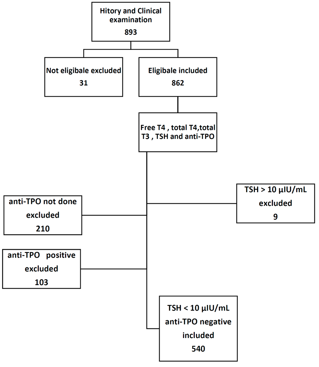 This study involved 893 selectively referred pregnant women; 31 of them were further excluded after detailed history and physical examination, and 9 women were also excluded because of high TSH value >10 μIU/mL. A total of 643 women were tested for anti-TPO; of them, only 103 patient tested positive, while the remaining 540 women distributed throughout different trimesters of pregnancy, 123 women in the first trimester, 246 women in the second trimester, and the remaining 171 women in the third trimester.