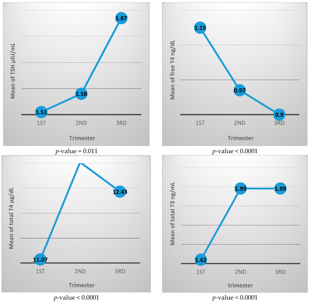 In this study, by tracking the TSH mean value for each trimester (Figure 2), we noticed that the TSH value in the first trimester is lower than in the second trimester while the third trimester has the highest value during pregnancy.