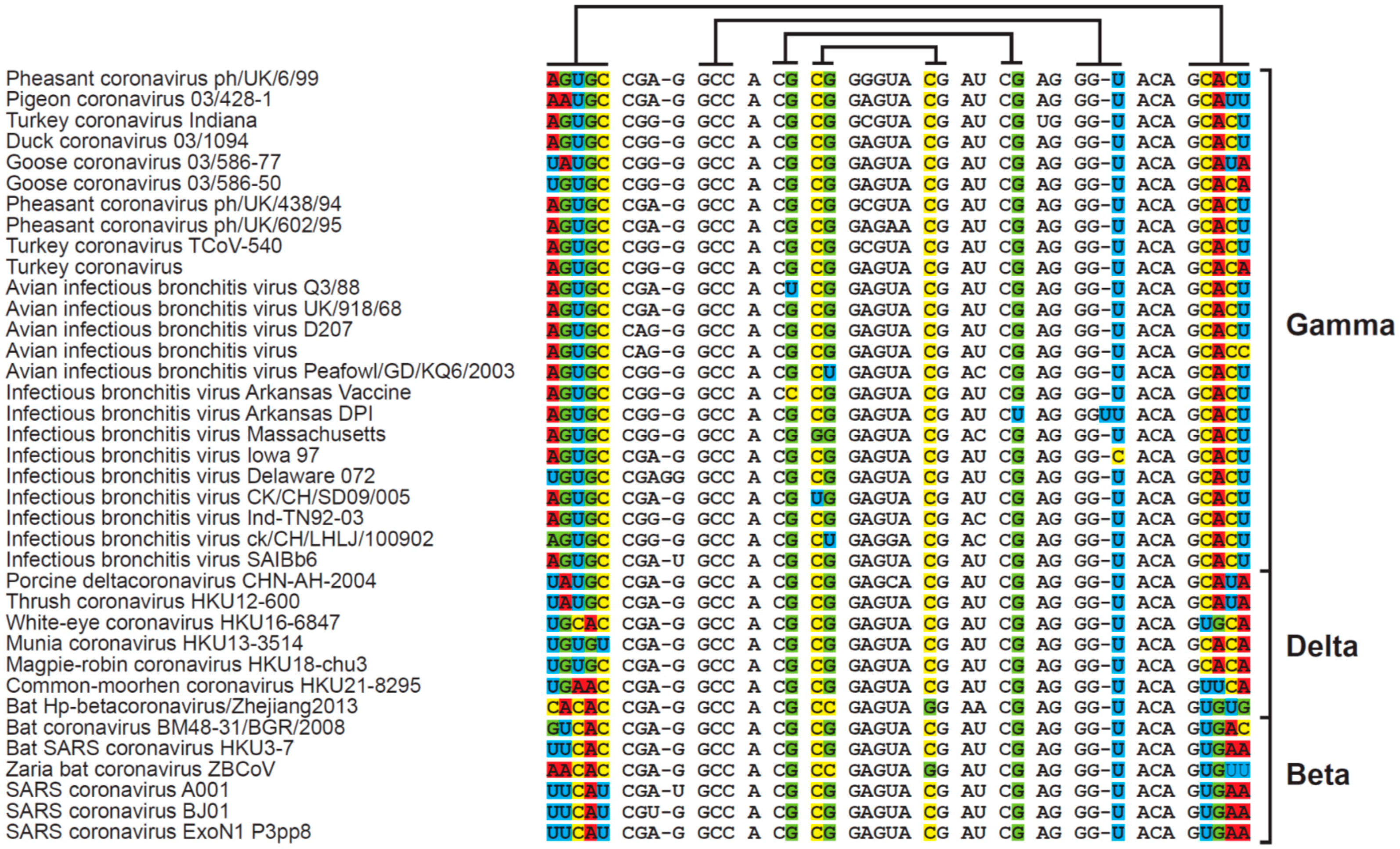 s2m coronavirus sequence motifs. For each genotype, one representative accession was chosen to illustrate the conserved nature of s2m both on a primary (‘sequence’) level and on a secondary (stem-loop structure) level. Lines above alignment indicate co-varying/stem-forming elements and columns with non-conserved bases for these nucleotide positions have been color coded.