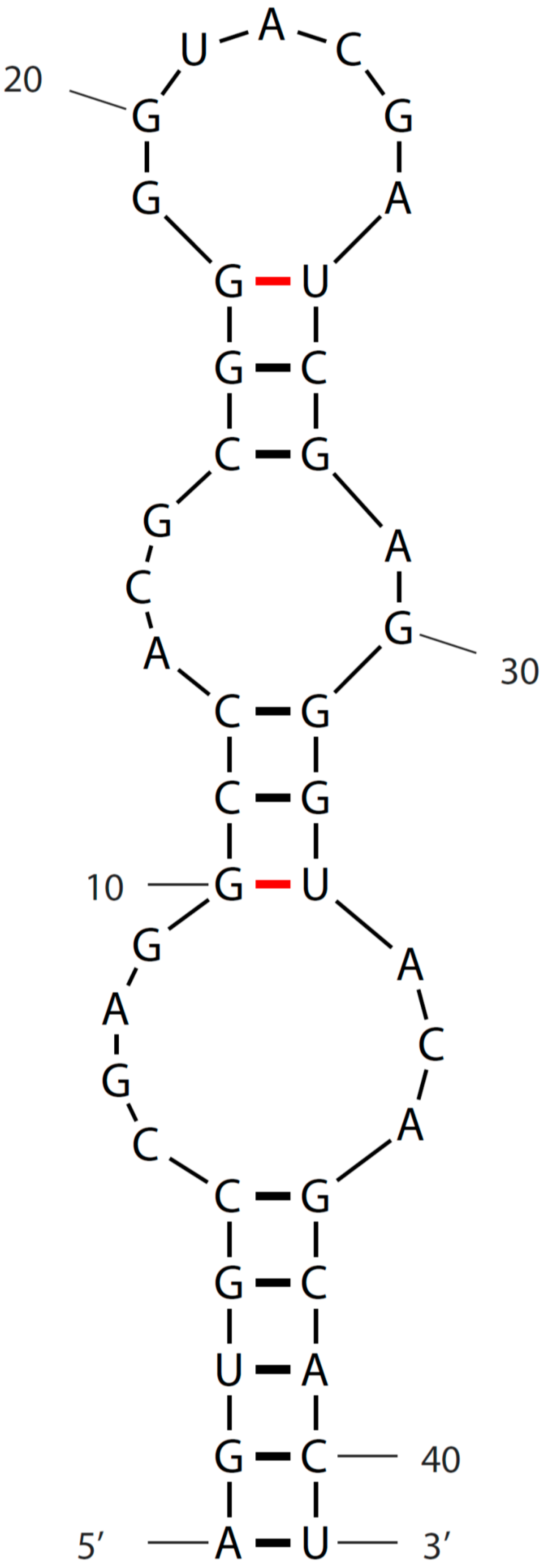 - Varani, G.; McClain, W.H. The G × U wobble base pair. A fundamental building block of RNA structure crucial to RNA function in diverse biological systems. EMBO Rep. 2000, 1, 18–23. [Google Scholar] [CrossRef] [PubMed]