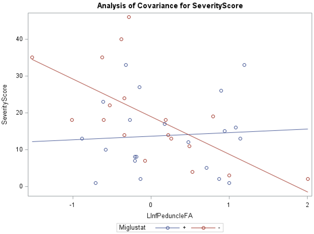 Analysis of covariance (ANCOVA; general linear modeling (SAS/STAT®, 2011)) assessed the associations between miglustat therapy and NNSS and subscores, with cerebellar volume, FA, and MD as respective covariates. Each ANCOVA model tested the assumption (null hypothesis) that the relationships of NNSS and subscores with cerebellar volume, FA, or MD were statistically similar for, or didn’t differ among, those receiving vs. not receiving miglustat therapy.