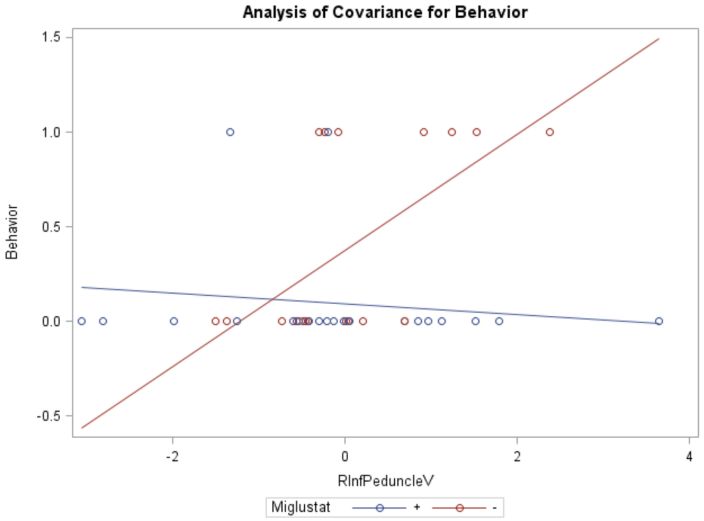 ANCOVA of behavior, miglustat, and volume of r inferior peduncle.