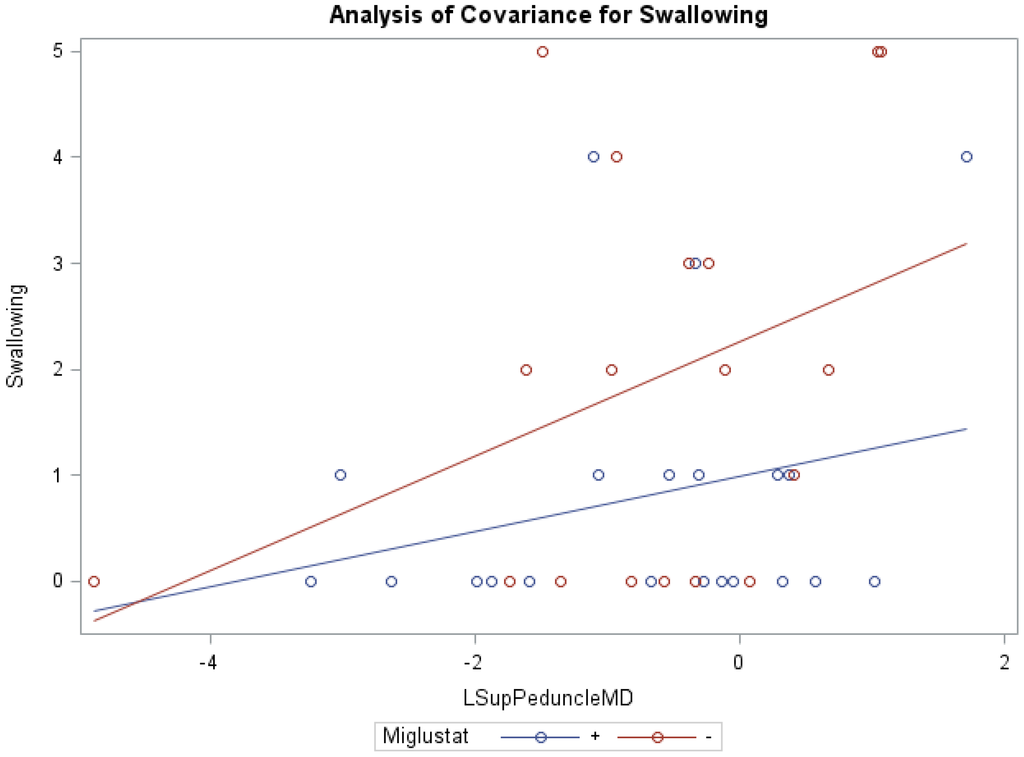 ANCOVA of swallowing, miglustat therapy, and MD of left superior peduncle.