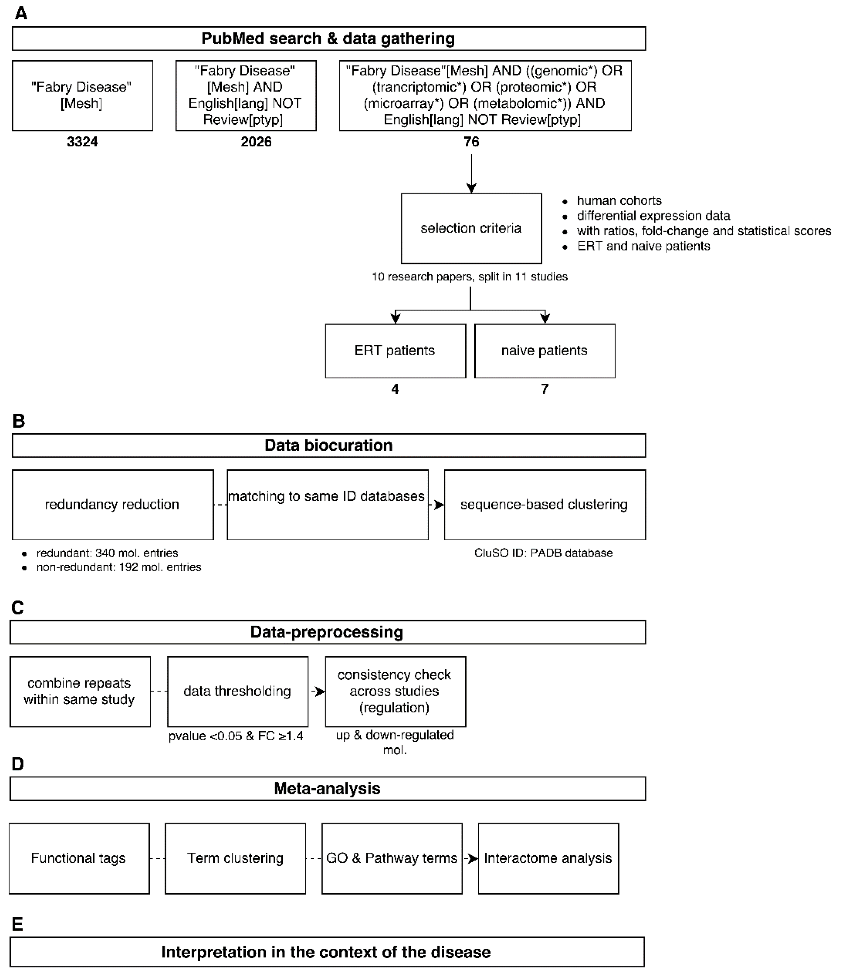 Omics studies and publications concerning Fabry disease are scarce and even more so for the availability of the underlying raw data. Thus, using the end-results of publications, i.e. tables and lists containing detected molecules, fold-changes in disease, statistical scores and other relevant molecular information acquired from omics discovery platforms as data source for a further meta-analysis, appears to be an alternative to fulfil the absence of native FD datasets.