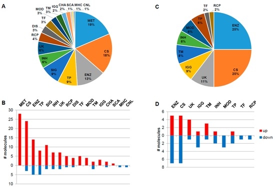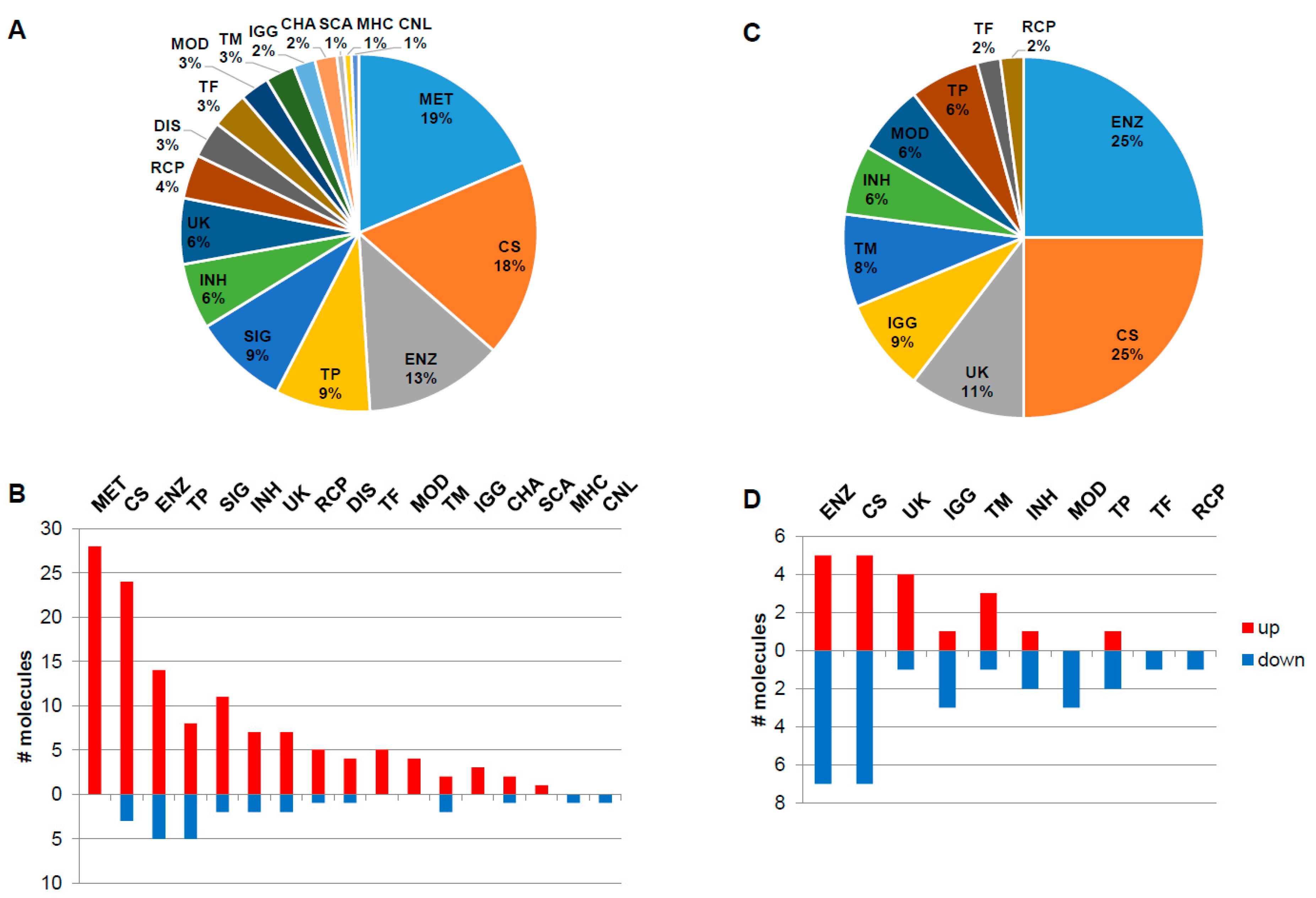 Functionality tag clustering of the total differentially expressed molecules (N = 151, fold-change ≥ 1.4 and p-value < 0.05) reported in the literature for the naïve group (A). Associated tags for deregulated molecules: down (N = 26) and up-regulated (N = 125) molecules (fold-change ≥ 1.4 and p-value < 0.05) reported in the literature for the naïve group (B). Functionality tag clustering of the total differentially expressed molecules (N = 48, fold-change ≥ 1.4 and p-value < 0.05) reported in the literature for the ERT group (C). Associated tags for deregulated molecules: down (N = 28) and up-regulated (N = 20) molecules (fold-change ≥ 1.4 and p-value < 0.05) reported in the literature for the ERT group (D). MET: metabolite; CS: Cell shape (cytoskeleton, cell adhesion, morphology, cell junction, cellular structures, extracellular matrix); ENZ: enzyme, enzymatic properties; TP: transport, storage, endocytosis, exocytosis, vesicles; SIG: signalling; INH: inhibitor (protease, kinase, other enzymes, pathways); UK: unknown; RCP: receptor; DIS: disease; TF: transcription and translation, gene regulation; MOD: modulator, regulator; TM: transmembrane; IGG: Immunoglobulin; CHA: chaperone, chaperonin; SCA: scaffolder, docking, adaptor; MHC: major histocompatibility complex component/protein cluster (MHC, HLA); CNL: channel.