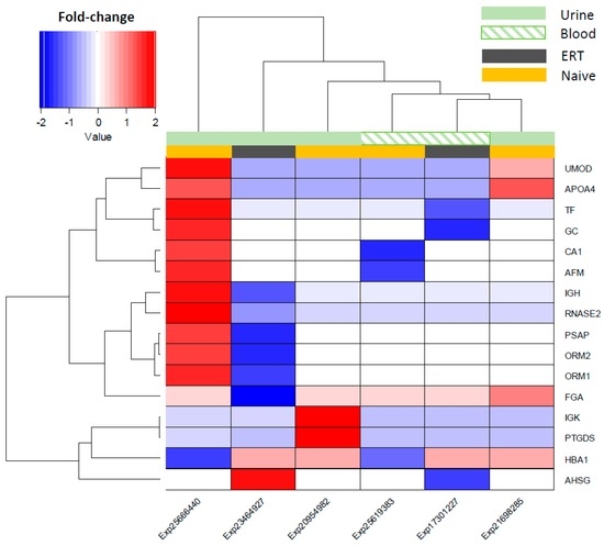 Hierarchical clustering was performed using fold-change values of the overlapping features (16 in total) across all Fabry studies in naïve and ERT patients, and the source fluids (urine and blood) which they were detected in as group modifiers (Figure 3). Overall, the expression of the overlapping molecules across Fabry studies points to an overexpression in the naïve group and a decrease for the ERT group (Figure 3). It can be observed that the studies Exp25666440 and Exp23464927, from the naïve and ERT groups, respectively, and both detected in urine, show a molecular expression pattern that is quite distinct from the other samples/studies. Based on the similarity of the molecular expression, the detected features can be split into two main clusters: one containing IGK, PTGDS, HBA1, and AHSG, and another containing UMOD, APOA4, TF, GC, CA1, AFM, GH, RNASE2, PSAP, ORM2, ORM1, and FGA (Figure 3). A list with the most frequently reported and consistently regulated molecules in Fabry-naïve and ERT groups can be found in the Supplementary Tables S1 and S2.